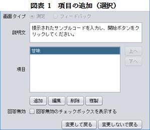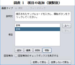 ※回答無効は回答の際に回答者が回答を無効としたい場合にチェックを入れます。時間情報を使う場合には回答にかかった時間が必要な情報となりますが、回答者が途中でサンプルをこぼしたり、退席したりして時間情報にイレギュラーがあった場合にはチェックを入れて無効であることを明示します。向こうにチェックを入れた場合は、再度同じ画面が表示されて回答します。データ上はどちらも記録されますが、「回答無効」列に無効となったデータは「1」が入力されます。有効データは「0」となります。 |